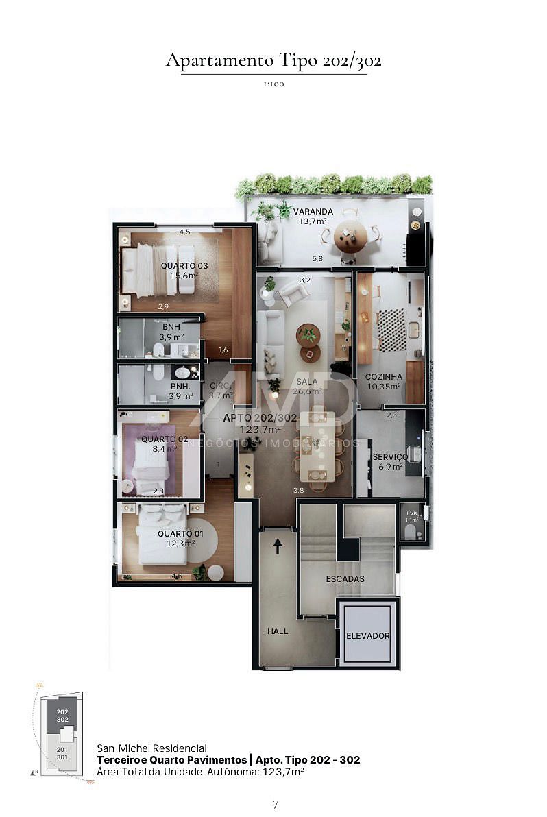 Com 133,6 m² de área privativa e 2 vagas de garagem independentes e amplas, o Apartamento Tipo 102 foi pensado para oferecer uma experiência de vida completa.