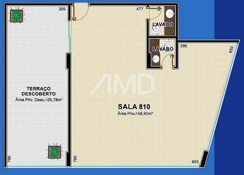 A Sala 810 destaca-se pela sua generosa área total de 84,18m², divididos em 58,40m² de área coberta e um valioso 25,78m² de área descoberta. Este espaço é preparado e ideal para ser uma clínica ou uma empresa que comporta um número maior de funcionários, oferecendo a versatilidade que seu crescimento exige: